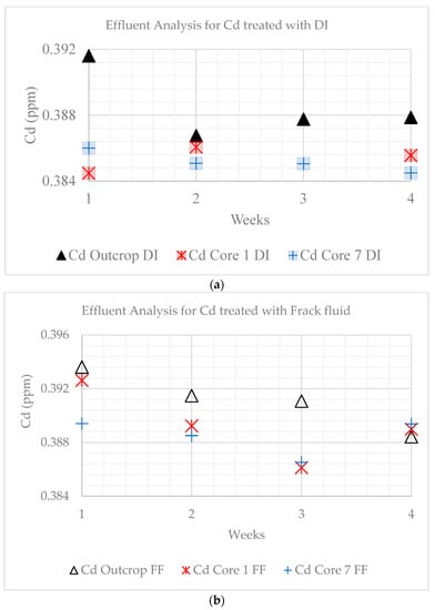 Cadmium levels were highest for the outcrop for DI water treatment, varying between 0.38 and 0.39 ppm. Core sample 1 values were 0.386 ppm on average and 0.385 ppm for core sample 7 when treated with DI water. There was a general decreasing trend for the three samples when treated with fracturing fluid; 0.39 to 0.38 ppm for the outcrop, 0.392 to 0.388 ppm for core sample 1, and 0.388 ppm on average for core sample 7 (Figure 26a,b).