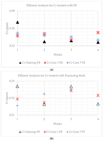 Effluent concentration variations in Cr. (a) Shows the variation in concentration for samples treated with DI water. (b) Shows variation in concentration when treated with FF. The highest values for Cr in the outcrop when DI water-treated.