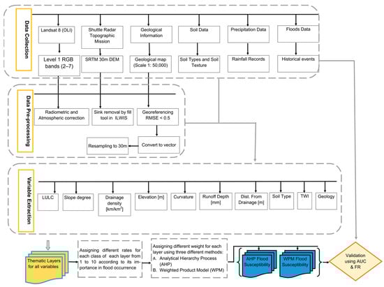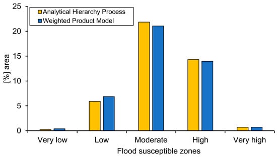 In this study, two weighted index overlay analysis methods, which have been successfully applied in many types of flood susceptibility mapping, landslide mapping, and groundwater mapping studies, were applied to generate two separate flood susceptibility maps. These methods were the weighted product model (WPM) [] and the analytical hierarchy process (AHP) [,].