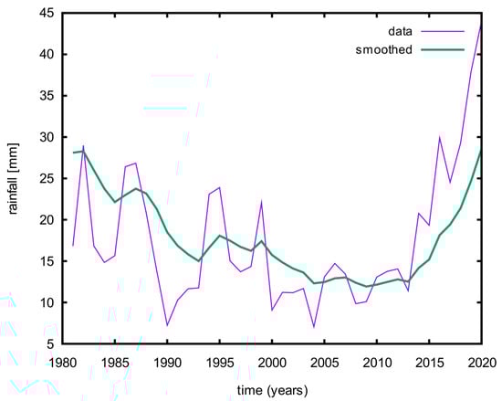 The Wadi Hanifah basin has a dry climate with an average annual temperature of over 45 °C during the summer (June to August). During the winter (January and February), the temperature varies between 2 and 25 °C. The annual precipitation is about 84.4 mm with a large interannual variance, as shown in the precipitation variance in Figure 3. Most of the basin area (32.17%) is made of two types of geological formations: (a) Jurassic formations, primarily in the western part of the study area, and (b) Cretaceous formations, which primarily exist in the eastern part of the study area.