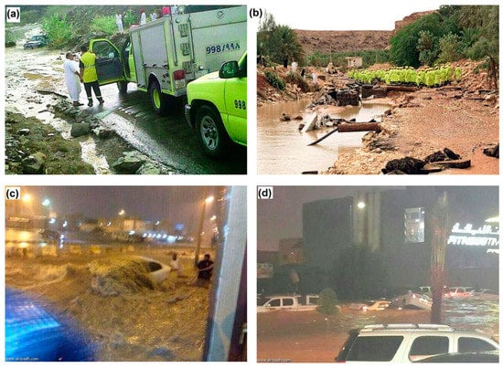 Photographs showing the severity of the flood that occurred on 19 November 2013 at Riyadh city, where (a) a big portion of the city infrastructure was damaged, (b) the disaster control demanded intensive work force, (c) so many properties were affected, and (d) human lives were threatened. (source: https://www.alriyadh.com/884573) (accessed on 7 January 2022).