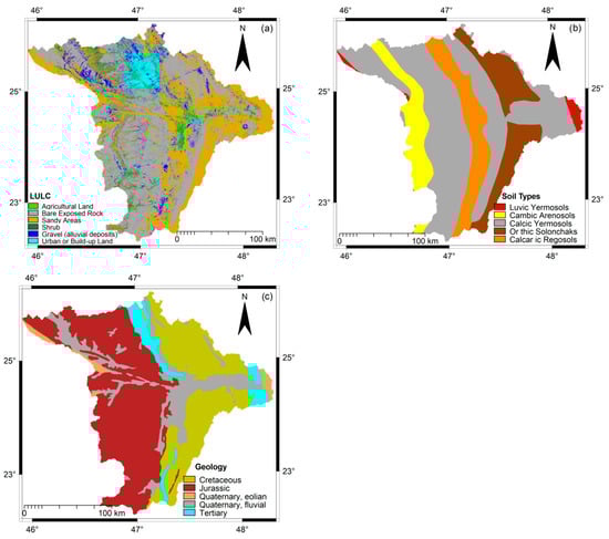 The environmental variables for flood susceptibility mapping: (a) land use/cover map, (b) soil type map, and (c) geology map.