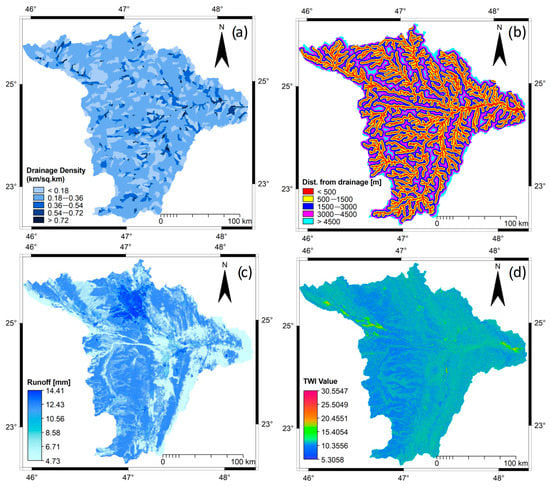 The hydrological variables for flood susceptibility mapping: (a) Dd map (km/km2), (b) distance from the drainage network map (m), (c) runoff (Q) map (mm), and (d) TWI map.