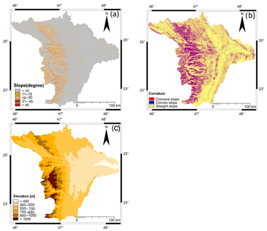The topographical variables for flood susceptibility mapping: (a) slope degrees map, (b) curvature map, and (c) elevation (meters) map.