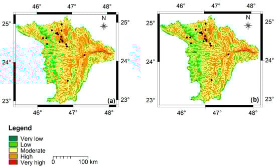 We used the frequency ration approach as a second validation method to spatially relate the historical events to the flood susceptibility map’s classes, aiming to compute the frequency (density) of the historical flood points that occur within each class. For this purpose, the historical flood locations were first rasterized. The cross operation of the ILWIS 3.4 GIS software was then used to overlay the obtained flood susceptibility maps with the rasterized map. In the overlay analysis, the pixels from both maps were combined at the same locations, and the combination that resulted in each flood susceptibility class was recorded and stored in a cross table []. A table aggregation function was used to obtain points (pixels) from the output cross table that was constructed within each flood susceptibility class. The flood susceptibility maps were considered valid if most (≥50%) of the historical flood locations were situated in the “moderate”, “high”, and “very high” flood susceptibility classes.