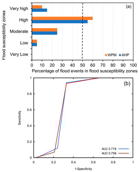To check the applicability of the adopted models to map the flood susceptibility areas, the results (i.e., flood susceptibility maps) need to be validated, preferably using historical flood locations. In this work, the efficiency and the performance of the AHP and WPM models were verified through employing two statistical methods, as follows: (1) the area under the receiver operating characteristics (ROC) curve (AUC), and (2) the frequency ration, which is the accumulation of historical flood locations within the flood susceptibility classes.