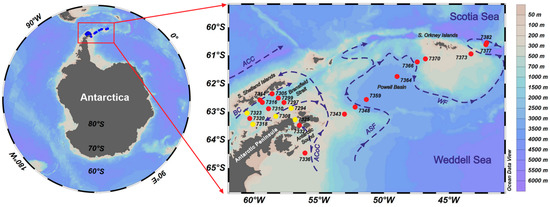 Map of the sampling stations and the main ocean currents designated according to [20,48,49,50]. Numerals are codes of the stations. Circles indicate plankton nets used at the stations: red is the Multinet, and yellow is WP-2. Dashed lines indicate currents in the study region: ACC is the Antarctic Circumpolar Current; BC, the Bransfield Current; ACoC, the Antarctic Coastal Current; ASF, the Antarctic Slope Front; WF, the Weddell Front.