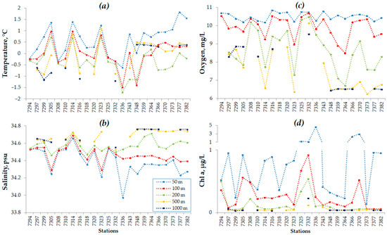 Values of water temperature (a), salinity (b), oxygen concentration (c), and chlorophyll a concentration (d) in the 50-, 100-, 200-, 500-, and 1000 m layers during the austral summer of 2022.