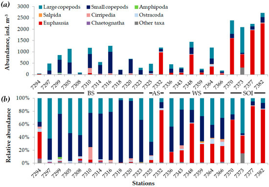 The total mesozooplankton abundance varied between 47.3 and 2797.8 ind. m−3 with a mean value of 970.3 ± 376.8 ind. m−3. The maximum abundances were recorded from off the South Orkney Islands (Figure 3a). At the stations of this area, euphausiids larvae numerically dominated (Figure 3b). At the rest of the stations, mesozooplankton abundances ranged from 300 to 1200 ind. m−3 with a trend to increase from west to east. Euphausiids larvae, being the most abundant group of mesozooplankton, constituted 39.9% of total abundance. It was noted that the greatest euphausiids larvae abundances mostly matched the stations characterized by high phytoplankton concentrations; as, e.g., at station (Stn.) 7332 eggs and nauplii of euphausiids accounted for >80% of total abundance. Phytoplankton cells were not counted, and phytoplankton concentration was estimated visually in the samples. The second abundant group of mesozooplankton, comprised of small-sized copepods, such as Oithona spp., Oncaea spp., and copepod nauplii (hereafter referred to as small copepods), constituted 27.2% of total abundance. Contributions of small copepods at the stations sampled in the Bransfield Strait were higher compared to other study areas (Figure 3b). The third abundant group of mesozooplankton was comprised of large-sized calanoid copepods, e.g., Calanoides acutus, Calanus propinquus, Metridia gerlachei, and Rhincalanus gigas (hereafter referred to as large copepods), that made up 24.7% of total abundance. At the stations, their distribution did not have any clear pattern. Other mesozooplankton taxa rarely accounted for more than 5% of total abundance (Supplementary Material).
