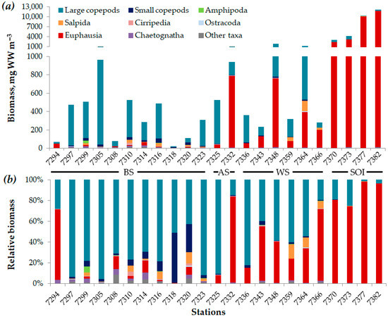 The total mesozooplankton biomass varied between 20.1 and 12,287.8 mg WW m−3 with a mean of 1757.5 ± 869.1 mg WW m−3. The highest biomasses were recorded from two groups of stations off the South Orkney Islands (1st group, Stns. 7377 and 7382; 2nd group, Stns. 7370 and 7373) (Figure 4a). In the 1st group, euphausiids larvae accounted for >90% of total mesozooplankton biomass; the stations of the 2nd group were characterized by generally high concentrations of large calanoid copepods and euphausiids larvae. At the other stations, the mesozooplankton biomass ranged from 100 to 1100 mg WW m−3 with no clear distribution pattern. Generally, at stations with concentrations less than 500 mg WW m−3, large calanoid copepods accounted for more than 50% of total biomass (Figure 4b). At some stations, other taxa of mesozooplankton contributed significantly to total biomass: e.g., small copepods constituted up to 48% (Stn. 7318); pelagic tunicates, mainly Salpa thompsoni, up to 12% (Stn. 7359); chaetognaths, up to 6% (Stn. 7314); amphipods, mainly Themisto gaudichaudii, up to 5% (Stn. 7299). We observed a tendency of total mesozooplankton biomass to increase, similarly to abundance, from the Antarctic Peninsula towards the South Orkney Islands.