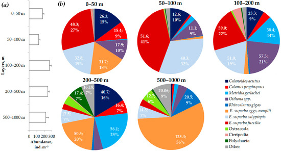 Vertical distribution (up to 1000 m) of the average abundance of mesozooplankton (a) and contribution of the major species/taxa (abundance, ind. m−3 and proportions, %) (b) off the western Antarctic Peninsula during the austral summer of 2022.
