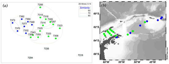 nMDS ordination plot (a) based on abundance of mesozooplankton by the Bray–Curtis similarity matrix, and location of the groups of stations in the inner (ISAP, green circles) and outer (OSAP, blue circles) sectors off the western Antarctic Peninsula (b). Blank circles mean non-recognized group.