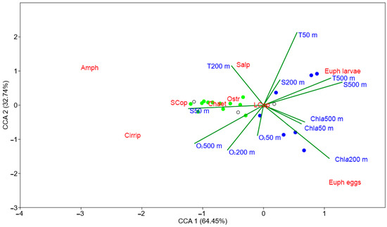 A canonical correspondence analysis (CCA) performed to assess relationships between the mesozooplankton composition and the environmental variables in the two sectors (ISAP and OSAP) together showed that the revealed models explained 97.1% of the total variation in the dataset (64.4 and 32.7% for the CCA1 and CCA2 axes, respectively) (Figure 9). The increase in the abundance of euphausiid eggs was associated with the high oxygen and Chl a concentrations and the low temperature in the 200 m (T 200 m) layer. In general, the higher concentrations of euphausiids larvae were associated with the high temperature in the surface (T 50 m) and 500 m (T 500 m) layers, the high salinity in the 200 m (S 200 m) and 500 m (S 500 m) layers, and a low oxygen concentration. The abundance of large copepods was poorly represented on the first two CCA axes (it was located close to the origin). The high salinity in the surface layer (S 50 m) was associated with the abundance of small copepods and other mesozooplankton aggregations, ostracods, amphipods, and chaetognaths. The abundance of pelagic tunicates was associated with the high temperature in the 200 m layer (T 200 m) and low Chl a conditions. The abundance of cirripeds cypris larvae was associated with the high salinity in the surface layer (S 50 m) and the high oxygen in the 500 m layer (O2 500 m), but the low temperature and the low Chl a concentration which is the predominant environmental conditions in the ISAP (green circles in Figure 9).