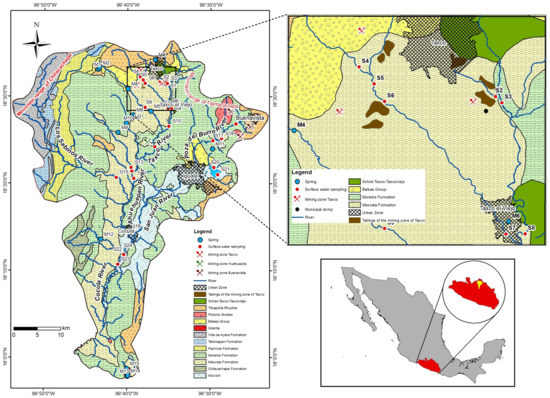 - Mendoza, O.T.; Ruiz, J.; Villaseñor, E.D.; Guzmán, A.R.; Cortés, A.; Souto, S.A.S.; Almazán, A.D.; Bustos, R.R. Water-rock-tailings interactions and sources of sulfur and metals in the subtropical mining region of Taxco, Guerrero (southern Mexico): A multi-isotopic approach. Appl. Geochem. 2016, 66, 73–81. [Google Scholar] [CrossRef]