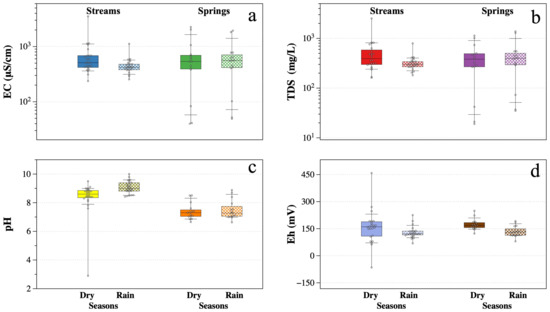 Box-and-Whisker plots for physicochemical parameters of surface water and springs for the dry and rainy seasons: (a) Electrical Conductivity (EC), (b) Total Dissolved Solids (TDS), (c) pH, and (d) oxidation–reduction potential (Eh).