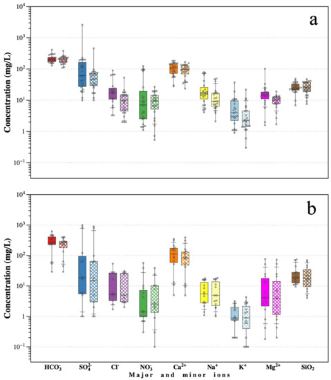 Box-and-Whisker plots for major and minor ions: (a) surface water and (b) springs for the dry (flat boxes) and rainy season (gridded boxes).