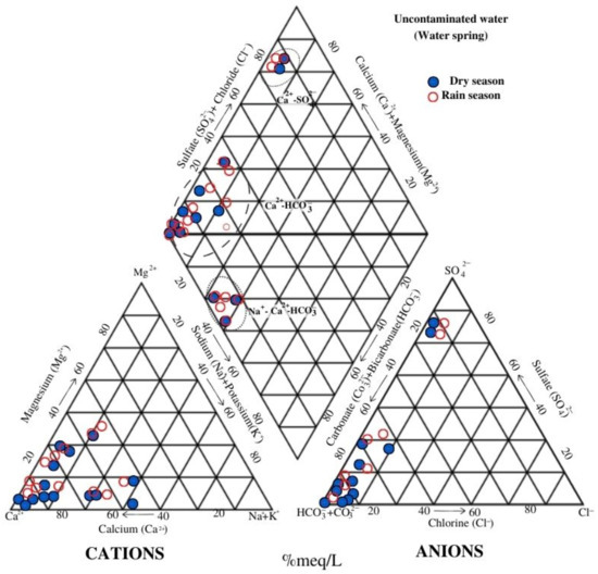 For springs, in the dry season the median was 112.2 and 83.9 mg/L in the rainy season (Figure 3b). The ion concentration for surface water in the dry season had a median of 16.6 mg/L, whereas in the rainy season it was 9.3 mg/L (Figure 3a). For springs, the median was 5.3 mg/L in the dry season and 4.9 mg/L in the rainy season (Figure 3b). The ion concentration for surface water in the dry season registered a median of 4.0 mg/L, and in the rainy season it was 2.2 mg/L (Figure 3a). For springs, the median was 0.9 mg/L in the dry season and 0.9 mg/L in the rainy season (Figure 3b). The ion concentrations for surface water had a median of 14.7 mg/L in the dry season and 10.2 mg/L in the rainy season (Figure 3a). For springs, the median was 4.2 mg/L in the dry season and 3.9 mg/L in the rainy season (Figure 3b). Finally, the concentration of ions for surface water in the dry season registered a median of 14.7 and of 10.2 mg/L in the rainy season (Figure 3a). For springs, the median value in the dry season was 4.2 and 3.9 mg/L in the rainy season (Figure 3b). Finally, a Piper’s diagram (Figure 4) shows the evolution of ground water represented by springs. The Na–Ca–HCO3 facies originates in the recharge zone of the Sierra de Taxco in volcanic rocks of the Tilzapotla Rhyolite. The Ca-HCO3 facie is in carbonate rocks of the Morelos and Mezcala formations and the Ca-SO4 facie is located to the south of the sub-basin in the discharge zone of the water system (Figure 1). The statistical values of major and minor ions, measured in surface and ground water, from the Taxco-Cocula hydrological sub-basin are provided in Table S1 (Supplementary Material). The minimum (Min), maximum (Max), medians and the 10th percentile (P10), and 90th percentile (P90) values, as well as the interquartile range (IQR) show the behavior of major and minor ions and HM concentrations throughout the Taxco-Cocula hydrological sub-basin.