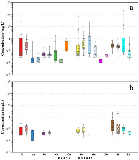 Cd, Cu, and Pb for spring water were found to be < DL (in both seasons) (Figure 5b, Table 6). In regard to the hydrogeochemical characteristics of springs, we considered those with low HM concentrations to be the sum of natural chemical reactions with ground water and minerals contained in the rocks without influence from mining activities.