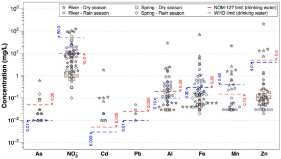 Previous research, carried out in the recharge zone of the hydrological Taxco-Cocula sub-basin, showed that the water quality from the tributary streams of the Taxco and Cacalotenango rivers was not fit for human consumption, due to high contents of Pb and other HMs [3,12,13]. Despite this finding, surface water in the hydrological Taxco-Cocula sub-basin is the main water source for the population in both seasons. On the other hand, Ramirez Javier [14] evaluated concentrations of HMs in ground water near the recharge areas in the hydrological Taxco-Cocula sub-basin and found the concentrations of HMs did not exceed the permissible limits of national and international standards for water for human consumption, NOM-127-SSA1-2021, and the World Health Organization (WHO) standards [15,16].