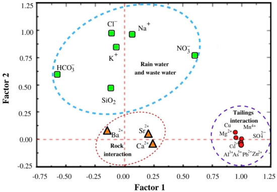 Recently, Quevedo-Castañón et al. [35] suggested that natural mixing of AMD with natural runoff water from streams in the area helped with AMD neutralization in Taxco. This is consistent with the correlation analysis of the rainy season that evidenced this component. A multivariate analysis was performed to improve the contrast between physicochemical variables, major ions, and the HMs in the dry season, by using Principal Component Analysis. Table S3 (Supplementary Material) shows the concentration values and the percentages of total variance for each variable. Component 1 explained 55.0% of the variance, related to , , , , , , , , and confirming their origins as being from mining tailings. Component 2 explained 20.5% of the variance and the higher weight was associated with , , , , , and variables, suggesting mixing with rainwater and urban wastewater. Component 3 explained 11.2% of the variance, with the higher weight associated with Ba2+, Sr2+, and Ca2+, as suggested in the correlation analysis. Figure 7 presents the three main components associated with the multivariate analysis, confirming the processes associated with the observed chemistry on surface water, which were also in accordance with the correlation matrices for both the rainy and dry seasons.