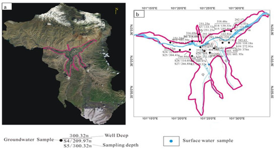(a,b) Groundwater and surface water sampling distribution map, (a)—Remote sensing image map of the Guide Country.