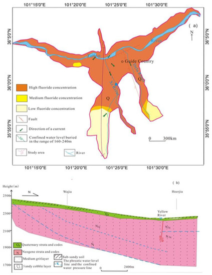 Spatial distribution of fluoride in groundwater. (a) Spatial distribution of fluoride in groundwater in Sanhe plain of Guide Country (The depth is 160–240 m under confined Geothermal water) (b) Hydrogeological section.
