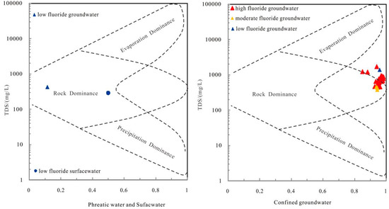 The Gibbs diagram was used to further analyze the fluoride sources of water samples. (Figure 4). All water samples fell within the dominant zone of rocks, indicating that the chemical properties of the groundwater and surface water in the study area are controlled by weathering or the rock and water–rock interactions. In contrast, the groundwater samples which fall in the partially balanced or mixed water area indicate that the geothermal water may be mixed with cold water near the surface (Figure 5).