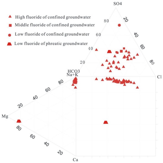 The enrichment of fluoride in water is controlled by a specific hydrochemical environment. A Piper diagram (Figure 6) was plotted to understand the impacts of the hydrochemical facies on the fluoride enrichment in water, as well as the high-fluoride groundwater mainly distributed in areas with Na+ contents (meq) > 80%; and HCO3− contents (meq) > 60%. Hydrochemistry analysis of geothermal fluids shows that the high-temperature thermal water is mainly of SO4 · Cl–Na type, and the low-temperature thermal water is mainly composed of SO4–Na, SO4 · HCO3–Na. The piper diagram indicates that F− enrichment is usually associated with high HCO3− and Na+ concentrations in water (Figure 5), while a high Ca2+ concentration tends to lower the F− concentration in water. Therefore, fluorite (CaF2) can be dissolved and F− is released into groundwater with Na-bearing salts, or alternatively F− can react with Ca2+ to form fluorite (Figure 7).