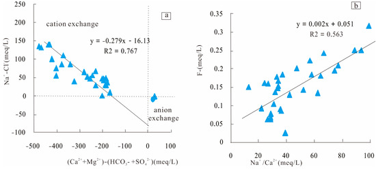 Fundamentally, the concentrations of major ions are the most affected factor in the hydrochemical environment. As shown in the Pearson correlation matrix (Table 3), HCO3− is significantly correlated with Mg2+ (r = 0.526) and the saturation index is lower than 0, indicating that carbonate mineral dissolution is an essential process in the groundwater system. This is consistent with the result of Wang Zhen’s research, which promotes the increase of bicarbonate chemical compositions of confined groundwater. This process is controlled mainly by the dissolution of evaporite, which commonly increases along the flow path [13]. Moreover, the ion exchange between calcium ions and sodium ions may lead to fluoride enrichment in natural water. As mentioned above, high-sodium and low-calcium water are favorable for fluoride enrichment, and thus the changes in sodium and calcium concentrations caused by ion exchange will inevitably affect fluoride behavior. In this study, the binary graph of Na+-Cl− vs. (Ca2+ + Mg2+)-(HCO3− + SO42−) is utilized to explain the cation exchange process [2]. This shows that there is a linear relationship between Na+-Cl− and (Ca2+ + Mg2+)-(HCO3− + SO42−), with a slope of −0.279 (r = 0.767). The slope is far less than 1, indicating that the ion exchange is not too strong, and most of the samples are located in the cation exchange control area rather than the anion exchange area, which indicates that the exchange of Na+ and Ca2+/Mg2+ may occur in the study area (Figure 7a). Indeed, this is good evidence that the cation exchange plays an important role in regulating the chemical evolution of natural water. Additionally, the positive correlation between F− and Na+/Ca2+ ratio with a slope of 0.002 (r = 0.563) indicates that the cation exchange between Na+ and Ca2+ affects the fluoride enrichment in the study area (Figure 7b).