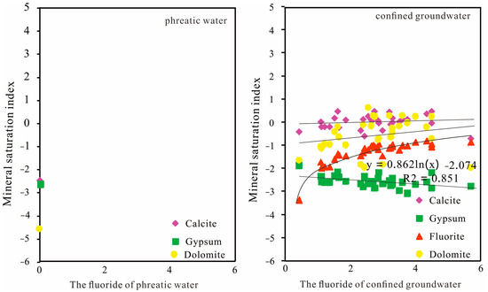 The sedimentary lithology of the confined aquifer in the Guide basin is mainly composed of dark gray mudstone, earthy red clay, and dark gray fine sand. Furthermore, the main minerals in the composition are quartz, aragonite, mica, and albite. In addition, the Xining Group (Exn) is composed of reddish-brown mudstone, sandy mudstone, lime-green gypsum, lime-white gypsum, sandy argillaceous gypsum, and siltstone convex body. The rock composition of each stratum is mainly a set of flysch clastic rocks, siliceous rocks, some carbonate rocks, and a few volcanic rocks, which constitute the main provenance of Cenozoic basins in the southern and northern margin of the basin. The dissolution or precipitation of minerals depends on the saturation indices of minerals, which are used to denote the saturation state of water relative to minerals and indicate the dissolution or precipitation behavior of minerals. On the other hand, the impacts of mineral saturation on fluoride enrichment can be understood by calculating the saturation indices of fluoride bearing minerals, such as dolomite, calcite, gypsum, and fluorite. The dissolution behavior of these minerals was notably interdependent since they all contain calcium ions. The low solubility of gypsum will lead to the high solubility of fluorite [28]. Furthermore, the saturation index of calcite varied from −3.53 to 0.74, and that of dolomite ranged from 6.03 to 0.3, indicating that dolomite and calcite are unsaturated or close to saturation. The saturation index of gypsum was −3.62~−1.6, indicating that gypsum is also unsaturated. This implies that calcite, dolomite, and gypsum can continue to dissolve and release Ca2+ into groundwater, which will affect the fluoride enrichment in natural water (Figure 8). The saturation index of fluorite ranged from −3.37 to 0.01, indicating that fluorite is unsaturated. Meanwhile, fluorite dissolution contributes to an increase in fluoride content. This can be confirmed by the logarithmic positive correlation between fluoride and fluorite saturation index (R2 = 0.851).