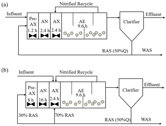 Schematic flow diagrams of (a) A2O and (b) SSH reactors in this study. AN: anaerobic tank; AX: anoxic tank; AE: aerobic tank; RAS: return activated sludge; WAS: waste activated sludge. The value in each tank was the corresponding HRT. The values in brackets were recycle ratios.