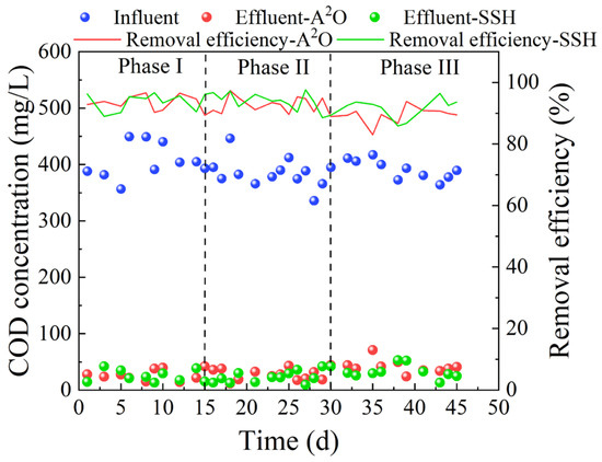 Variations in COD removal performance during each phase of the experiment are shown in Figure 2. In Phase I, the average effluent COD in the A2O and SSH reactors were 27 mg/L and 25 mg/L, respectively, with an average removal efficiency of ~93% for both reactors. As the DO concentration decreased to the low level of 0.5–2.2 mg/L in Phase II and the moderate level of 2.2–3.9 mg/L in Phase III, the COD removal performance in both reactors was generally stable, with a removal efficiency of 91 ± 3% for the A2O and 93 ± 3% for the SSH reactor. Overall, more than 85% of the effluent in both reactors was below 50 mg/L during the experiment, meeting China’s Class 1A Discharge Standard for Municipal WWTPs (Table S2). Even at low DO levels, both reactors maintained stable COD removal performance (93 ± 3%), with all effluent samples meeting the Class 1A Standard. As shown in Figure S1, most influent COD was consumed in the anaerobic and/or anoxic tank before entering the aerobic zone [35,36].