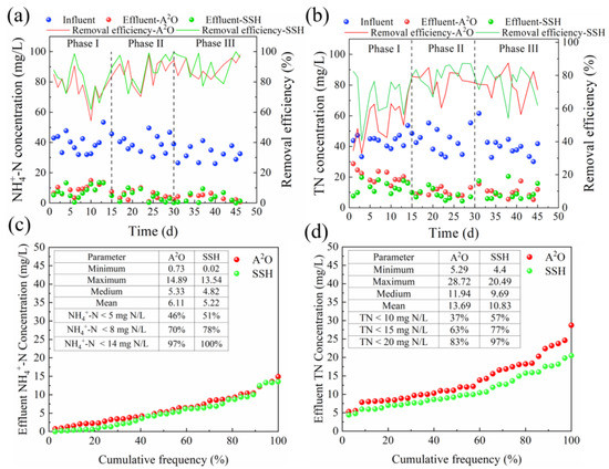 Comparison of (a) NH4+-N and (b) TN removal performance, and cumulative relative frequency distribution for effluent (c) NH4+-N and (d) TN between the A2O and SSH reactors during the experiment.