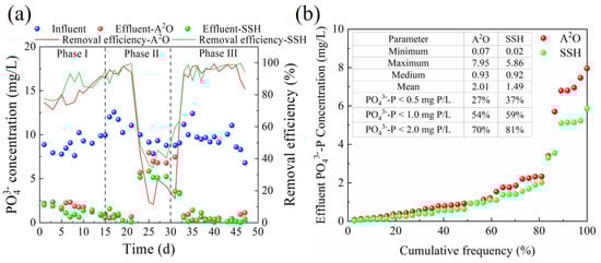 Comparison of (a) PO43−-P removal performance and (b) cumulative relative frequency distribution for effluent PO43−-P between the A2O and SSH reactors during the experiment.