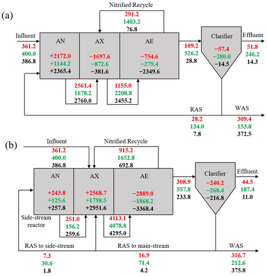 Fate of PO43−-P in (a) the A2O and (b) the SSH reactors during the experiment. Values in red, green, and black represent the fate of PO43−-P in Phase I, II, and III, respectively. Values with plus and minus signs represent PO43−-P release and uptake, respectively. AN: pre-anoxic and anaerobic tanks; AX: anoxic tank; AE: aerobic tank; RAS: return activated sludge; WAS: PO43−-P in the waste activated sludge. Units are in mg P/d.