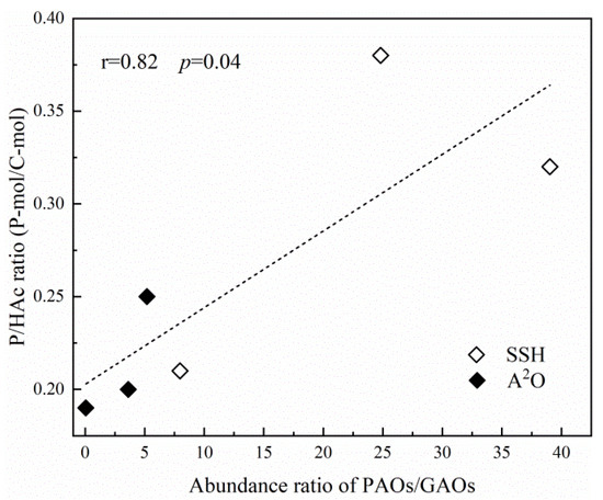 The anaerobic P-release/C-uptake ratio has been considered one of the most suitable indicators for evaluating PAO and GAO activity [5,11,22,50]. As PAOs are the only organisms known to release phosphate during anaerobic VFA uptake, a high P-release/C-uptake ratio has been considered indicative of PAO presence, while a low ratio suggests the presence of GAOs. During the experiment, the anaerobic P release to acetate uptake (P/HAc) ratio was in the range from 0.19 to 0.25 and 0.21 to 0.38 P-mol/C-mol in the A2O and SSH reactors, respectively, indicating competition between PAOs and GAOs, and potentially higher PAO abundance in the SSH reactor. Coincidentally, our microbial population results (Section 3.4.2) showed a significant positive correlation between the P/HAc ratio and the abundance ratio of PAOs/GAOs (correlation coefficient r = 0.82, p = 0.04) (Figure 6). The PAO/GAO abundance ratios in the SSH reactor (7.98–39.03) were much higher than those in the A2O reactor (0.06–5.19), with the lowest ratio obtained in Phase II at low DO levels.