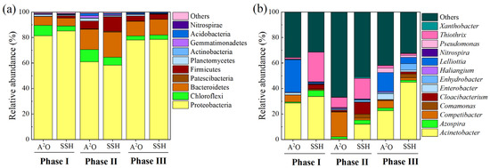 The relative abundances of microorganisms in the two reactors during the experiment are shown in Figure 7. The dominant phylum was Proteobacteria, with a relative abundance from 60.9% to 81.4% in A2O reactor and 58.2% to 85.1% in the SSH reactor. Proteobacteria was a common phylum in the activated sludge systems, containing many microorganisms related to the degradation of organic matter and nutrient removal (e.g., some known DNB and PAOs) [51,52,53]. In addition, Bacteroidetes (6.9–15.9% and 6.2–19.7%, respectively) and Chloroflexi (3.2–9.6% and 3.5–6.3%, respectively) were also the main phyla in the A2O and SSH reactors. Bacteroidetes were found to favor denitrification [54]. Chloroflexi was able to provide a stable framework for active sludge and played an important role in removing pollutants [55,56].