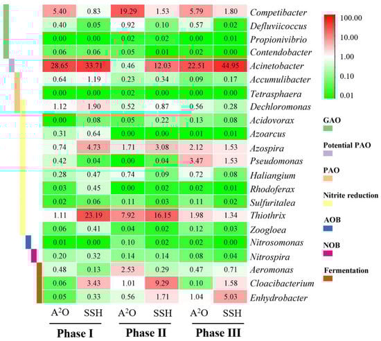 Relative abundance of functionally relevant microorganisms in the A2O and SSH reactors during the experiment.
