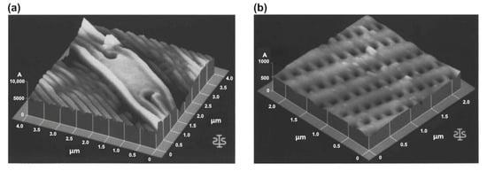 First AFM images of microalgal cells. Three-dimensional topographical images of diatom from the genus Craticula: central node, scan size 4 µm × 4 µm and vertical scale 1 µm (a); inside view of the frustule, scan size 2.5 µm × 2.5 µm and vertical scale 100 nm (b). Reprinted with permission from [12].