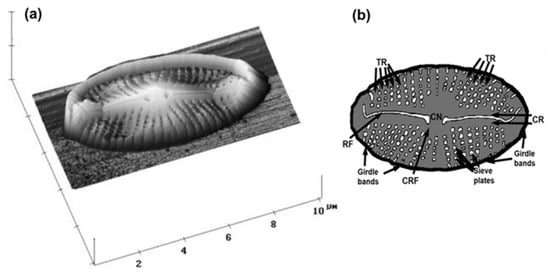 First AFM image of the whole living microalgal cell. AFM image of diatom, Navicula pellicullosa, presented in 3D topographic view (scan size 10 µm × 10 µm; vertical scale 2 µm) showing raphe fissure and complex structure of pores and poroids (a); schematic drawing of a diatom frustule; CR—central rib, CN—central nodule, TR—transapical rib, RF—raphe fissure, CRF—curve-ended side of raphe fissure (b). Reprinted with permission from [13].