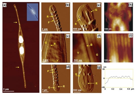 AFM image of a whole Cylindrotheca closterium cell with inset optical micrograph (a) and its morphological details (b–i). Comparison of valve (h); and girdle band regions (i) at high resolution, with girdle band height profile. Images were acquired using contact mode in air and are presented as height data (a,f,h,i) with vertical scales of 700 nm (a), 250 nm (f), 25 nm (h) and 250 nm (i) and deflection data (b–e,g). Arrows in (a) indicate the spiral twist around the longitudinal cell axis. Labels V, G, R, F and B indicate the following features: valve, girdle band, raphe opening, fibulae and boundary between valve and girdle band, respectively. Reprinted with permission from [29].