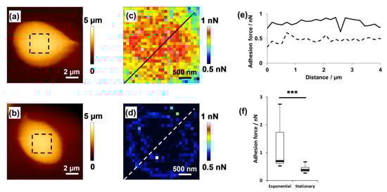 Hydrophobicity of alga D. tertiolecta. Height image of an algal cell in the exponential phase (a); height image of an algal cell in the stationary phase (b); adhesion force map (c) measured by the interaction between the hydrophobic AFM tip and the selected cell area shown in (a); adhesion force map (d) of the selected cell area shown in (b); cross-sections from the adhesion force maps in the exponential phase (full line) and stationary phase (dashed line) (e); statistical analysis of hydrophobicity (f). Significant differences were observed (***). Reprinted with permission from [20].