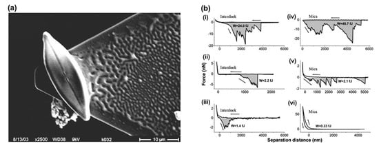 Cell probe experiments. SEM micrograph of a single diatom cell attached with epoxy glue to an AFM tipless cantilever (a); representative force–distance curves obtained with bioprobe diatoms in the stationary phase on Intersleek (i–iii) and mica (iv–vi) surfaces (b). The work of detachment, W, is given in fJ units (10−15 J) for each curve. The arrow represents the approach and retraction directions. Reproduced with permission from [35].