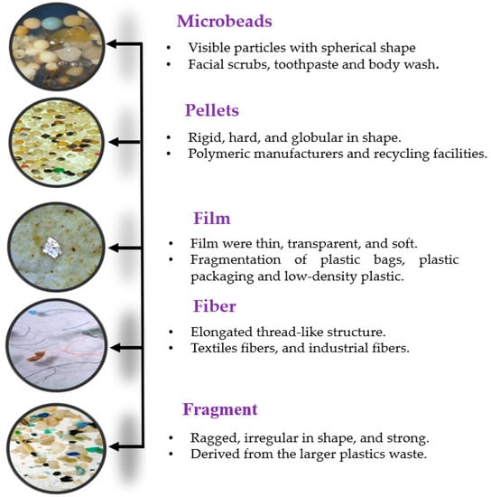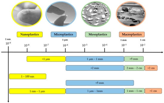 Plastics have become an integral part of modern society because of their versatility, durability, and affordability. However, their widespread use has led to the proliferation of microplastics, defined as plastic particles smaller than 5 mm. Figure 1 shows the size-based classification of plastic particles proposed by different authors. Microplastics (MPs) are ubiquitous in the ecosystem and have been found in land, oceans, freshwater systems, and air. Microplastics are tiny plastic particles that are less than 5 mm in size and are becoming a significant environmental concern owing to their persistence, abundance, and potential impact on ecosystems and human health [1,2]. They are produced both intentionally, such as in personal care and cleaning products, and unintentionally through the fragmentation of larger plastic items that can come from various sources, including cosmetic products, clothing, and packaging materials [1]. There is growing environmental concern due to the widespread distribution of microplastics in the environment and their potential ecological and human health impacts. The persistence of microplastics in the environment, combined with their ability to absorb and transfer toxic contaminants, raises significant concerns about their impact on wildlife, ecosystems, and human health [2]. They are widely distributed in the environment, including land, oceans, freshwater systems, and air. In recent years, increasing research has been conducted on the occurrence and distribution of microplastics in various environmental media, including seawater, sediments, soil, and biotic tissues [3,4]. These studies have revealed the presence of microplastics in virtually every corner of the planet, including remote areas such as the Arctic and deep sea [5]. Despite the growing body of research on microplastics, many uncertainties and knowledge gaps remain, particularly with regard to the ecological and human health impacts of these particles [6]. Furthermore, there is a lack of effective measures to reduce the release of microplastics into the environment, as well as limited capacities for removing them once they have entered the environment [1]. Several studies have been conducted to determine the sources of microplastics in the environment. The main sources of microplastics are the breakdown of large plastic debris and the discharge of microplastics from various industries, including the cosmetic and textile industries. Other sources include the release of microfibers from synthetic textiles during washing and the release of microbeads from personal care products, such as toothpaste and exfoliating scrubs [3]. One of the key challenges in understanding the sources of microplastics is the complex and diverse pathways through which they can enter the environment. According to a study by ENSSER [7], microplastics can enter the environment through various pathways, including wastewater discharge, atmospheric deposition, and the transfer of plastic debris from land to sea through stormwater runoff. The occurrence and distribution of microplastics have been studied globally in recent years, and research suggests that they are ubiquitous and pervasive. In a study by Koelmans et al. (2017), microplastics were found in all major oceanic gyres and in all samples collected from the Arctic to the Antarctic [8]. Similarly, another study by Eerkes et al. (2019) found that microplastics in lakes, rivers, and groundwater were present in all freshwater systems studied [9]. The impact of microplastics on the environment and biota is not yet fully understood, but laboratory and field studies have shown that they can have toxic effects on a variety of species, including marine mammals, birds, and fish [10]. Moreover, microplastics have been shown to adsorb toxic pollutants from the surrounding environment, making them even more hazardous to wildlife and human health [11].