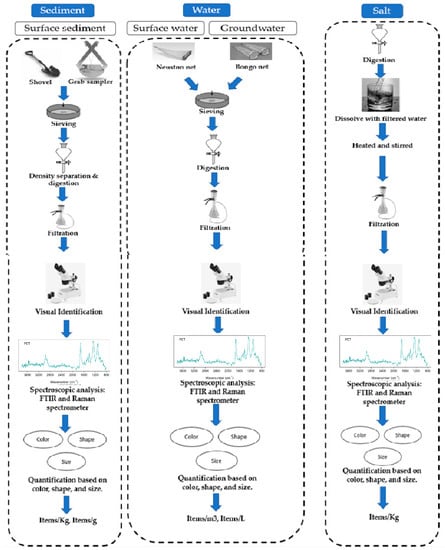The sampling is characteristic of terrestrial and aquatic habitats, sample methodologies are crucial in determining the abundance and polymeric composition of microplastic particles [68,69,70,71,72,73]. The water, sediment, and salt samples are typically collected using basic environmental sampling methods [74,75,76].