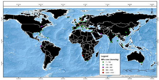 The lake waters and sediments of Simcoe in Ontario, Canada contain the first discovery of microplastic particles caused by manmade activities. Sediments and surface waters were collected from eight locations using low-volume grabs and manta trawls to evaluate the type and quantity of microparticles. Moreover, the surface water grab sample had concentration levels of microplastic particles ranging from 0 to 1 particles/L, the manta trawl sample had quantities of 0–1 items/m3, and soil samples had amounts of microplastic particles ranging from 8 to 1070 items/kg [135]. Isobe et al. (2016) stated that MPs such as microbeads were discovered in Hong Kong and Japanese marine water [138] and Felismino et al. (2021) found an astounding quantity of 342.2 billion microbeads in Hong Kong [135]. Veerasingam et al. (2016), have found pellets are major kind of microplastic particles, have been found on Goa beaches in India. The southern coast of Goa had far more (1150) pellet particles than the northern coast, with approximately 505 pellet particles [78]. Microplastic particles were more prevalent during the rainfall season than during dry weather. In the South Korean Nakdong River, the concentration of microplastics jumped between 260 to 1410 items/m3 during the summer months from 210 to 15,560 items/m3 during the wet season [139]. Nur Hazimah and Obbard studied microplastic particles in Singapore (2014). Obbard et al. (2006) examined the microplastic amounts between 2014 and 2006, which were greater than the microplastic quantity observed in 2006, which were found to be 12–63 items/kg of dry sediment in 2014 and 0–16 items/kg of dry sediments in 2006 [140]. In research by Fauziah et al. (2015) on the prevalence of microplastic particles on Peninsular Malaysian coastlines, 265 items/m2 of microplastics, including polystyrene (PS) and PE, were found [141]. Wang et al. (2017) conducted a study in Beijing River and found lot of microplastic pollutants microplastics—178 to 544 items/kg [142]. Microplastic particle concentrations in the Rhine and Main rivers of Germany were recorded as 228–3763 items/kg and 786–1368 items/kg, respectively [77]. In Northern Tibet, Lake Hovsgol, as well as the lakes in Siling, which are known for their low density of residents and minimal human activity, were analyzed, and the abundance of microplastics ranged between 14 and 1219 items/m2 [54]. Su et al. investigated microplastic particles in China’s most developed parts. Taihu Lake was found to have high levels of microplastic particles, with surface water concentrations reaching 3–26 items/L and dry sediment quantities reaching 11–235 items/kg. Cellophane and fibers with a size range of 100–1000 µm made up the majority of microplastics, while PE, terephthalate acid, polyester (PES), and PP were also present [143]. Peng et al. (2018) evaluated the existence of microplastic particles in river sediment samples from Shanghai, the largest urban region in China. They discovered a mean concentration of microplastics of up to 802 ± 594 items/kg of dry sediment, with polypropylene being the most prevalent polymer [144]. Bei Lake in central China has the highest concentration of microplastics, with quantities varying from 1660 to 8925 items/m3 [144], as investigated by Wang et al. (2017). Free et al. (2014) stated that the Laurentian Great Lakes and Lake Huron, both of which are more populated, have a substantially lower microplastic concentration of 20,264 items/km2 [145]. In Australia, Ziajahromi et al. (2017) found that treated wastewater revealed averages of 0.28, 0.48, and 2 items/L of microplastic effluent. PET fibers and PE with irregular shapes, which are typically seen in synthetic apparel and personal care items, were the most prevalent polymer types found [146]. Owing to contamination from a large human population and numerous enterprises, Italy’s quantity of microplastics demonstrated increased concentrations in landward areas. Microplastic quantities are inversely correlated with human density, activities, urban development, tourism, and anthropogenic factors [36,146,147,148]. Coastal sediments in South Africa ranged from 341 to 4757 items/m2 [149]. A lower concentration of microplastic particles, ranging from 204.5 to 1491.7 items/m3, was found in surface water by Nel and Froneman (2015). Kanhai et al. (2017) found microplastic particles in offshore Namibia: eight items/m3 [150]. The quantity of microplastic particles in the Bloukrans River was investigated by Nel et al. (2018) and compared to the summer (6.3 ± 4.3 items/kg): higher levels of microplastic were found in the winter (160 ± 139 items/kg) [56]. Between 2005 and 2014, the average concentration of microplastic particles in the surface water of Greenland grew by one to two items/m3 [151]. In 10 g of sediment samples from Huatulco Bay, there were 2–69 microplastic particles [61]. Microplastics were reportedly found at 1–805 items/m2 on the coastlines of the southeast Pacific coast [152]. According to Lusher et al. (2014), there are two items/m3 of microplastic particles in the northeast Atlantic Ocean [153]. On Portugal’s western coast, 66 items/m3 were recorded, and the Atlantic Ocean has an estimated plastic particle concentration of 1 to 2 items/m3, with most of the microplastic particles made of PE and PA [150]. Obbard et al. (2014) investigated microplastics in the Arctic Ocean region’s ice cores and abundance of microplastic particles ranging from 38 to 234 items/m3. The materials identified as microplastics included polyamide, polypropylene, polystyrene, and polyethylene [140]. Microplastics were identified in seawater samples taken from 18 locations in the northwest Pacific Ocean, with an average concentration of 104 items/km2. Polyethylene, polypropylene, and nylon were the three types of microplastics discovered [154].