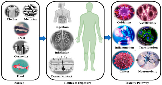 Groundwater and the surface of terrestrial and marine habitats both include various forms of microplastics. Most of the time, ingesting contaminated food, water, or cosmetics introduces microplastic pollutants into our biological system. Less than 1 mm in size, the microplastics have been found to have the ability to absorb into the human biological system. Ingestion is the main route by which microplastics enter living organisms [158]. Once microplastic-contaminated water or food is consumed, it can pass through the mucociliary barrier and enter the digestive tract, where it may cause oxidative stress, cytotoxicity, homeostasis, immune system dysfunction, neurodegenerative disorders, inflammation, alteration of metabolism, and modification of the composition of the gut microbes [19,158].