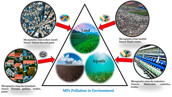 Source of MP pollutants in the terrestrial, aquatic, and atmospheric environments [37,38,39,40,41,42,43,44,45,46].