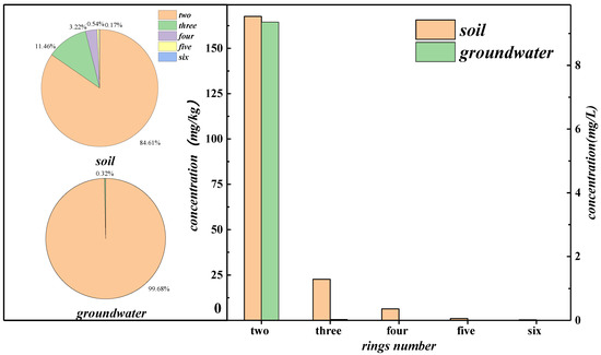 The ∑PAHs of groundwater ranged from 0 to 18.30 mg/L, with a mean of 9.39 mg/L. The point detection rate of PAHs was 65.38%. Like the soil, the average concentration of naphthalene in groundwater was the highest (8.92 mg/L). Unlike the soil, low- and medium-ring PAHs are mainly found in groundwater, while high-ring PAHs in groundwater are almost undetected. Low-, medium-, and high-ring PAHs of groundwater were 99.68%, 0.32%, and 0%, respectively (Figure 2). Apart from the difference in initial content, the phenomenon is also attributed to medium- and high-ring PAHs being more adsorbable and more challenging to enter groundwater through infiltration [31]. The phenomenon mentioned above is further analyzed in Section 3.2.2.