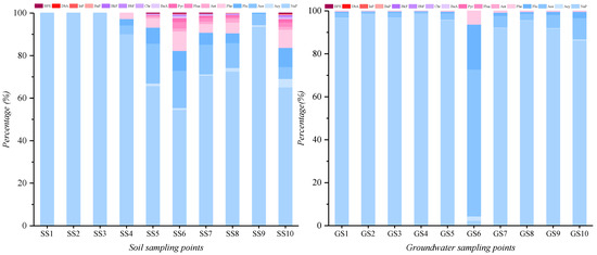 Figure 3 shows the PAH composition and structure changes of soil and groundwater sampling sites. As shown from the figure, soil-groundwater PAH species in the tar processing area increased significantly compared with the surrounding area. The main PAHs of SS5, SS6, SS7, SS8, and SS10 were Nap, Ace, Flu, Phe, Flua, and Pyr, mainly 2–4 rings. The main PAHs of GS6, GS7, GS8, GS9, and GS10 are Nap, Acy, Ace, and Flu; this is related to the function of the tar processing area. Tar is further refined in this area and stays much longer than in other areas. The infiltration of PAHs into soil and groundwater is more serious, so the types and composition of PAHs are more complex. Compared with soil, the proportion of low-ring PAHs (two rings) occupied in groundwater increased significantly because Nap, Acy, and Ace, as typical low-ring PAHs, have more substantial water solubility and migration ability to groundwater. In contrast, medium- and high-ring PAHs such as Flua and Pyr are more detected in shallow soil samples.